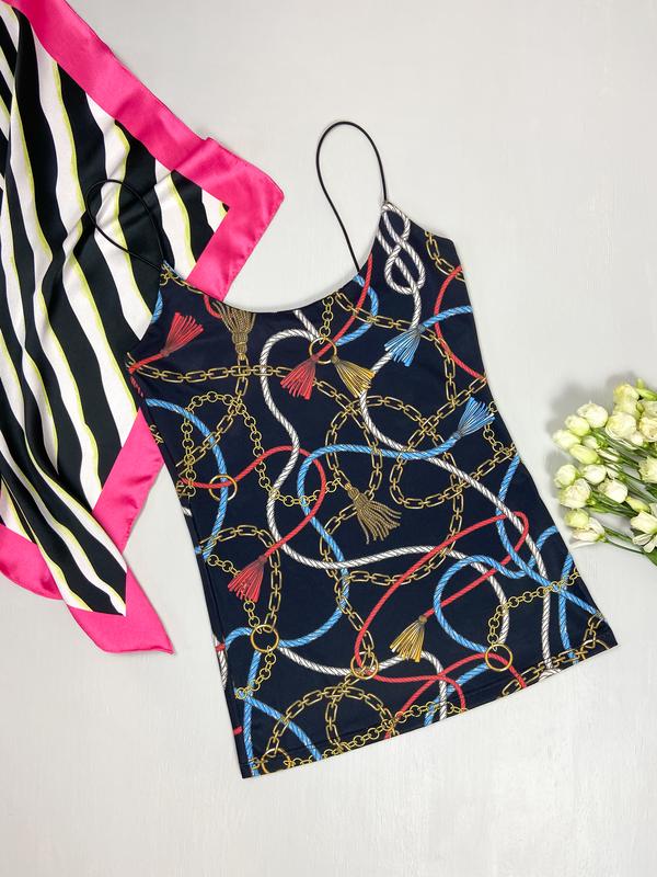 Принтована майка на тоненьких брительках Jennyfer (НОВЕ, з офіційного сайту, бірки втрачено) Розмір: S Склад: 96%поліестер, 4%еластан Тканина еластична, добре тягнеться. Чудово сідає на будь-які параметри в межах свого розміру Заміри: ПОГ 34см Довжина 58см без брительок 48см