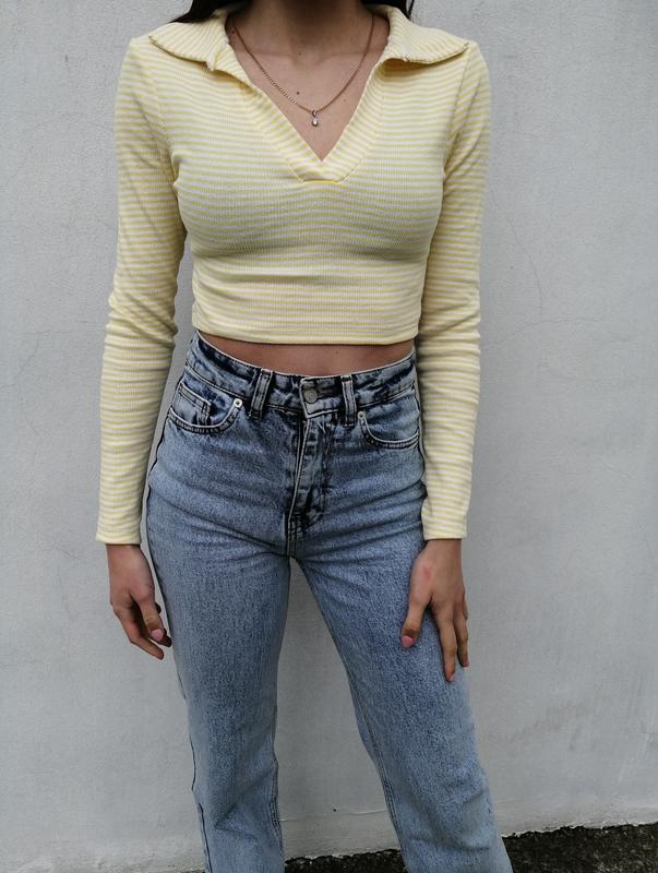Кроп-топ в полоску с красивым вырезом и воротничком 🤤 🔹Цена: 310 uah 💸 🔹Размеры: S. 🔹Цвет: голубой, желтый. 🔹Склад: 95% - бавовна, 5% - еластан.