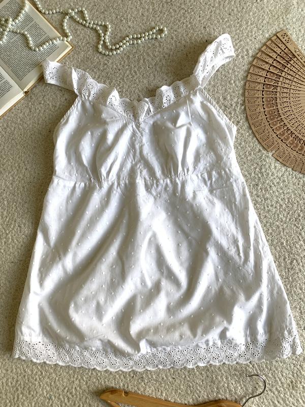 Нарядный белый летний топ из натурального хлопка. Мягкая легкая ткань, не просвечивает. Красивый дизайн с прошвой. Сзади на спине резинка. Стан - идеальный. Подходит на размер 10/38 и 12/40. П. о. груди 45-47 Длина 70 П.о. Под грудью 42-44 П. о. стегон 59 ● Обмену и возврат нет, перед заказом проверяйте все замеры. По запросу делаем дополнительные фото. ● Оплата на карточку Приватбанка 100% сумма, послеплаты нет. С Безопасной оплатой НЕ РАБОТАЕМ. ● Открытка Новой или Укр-почтой.