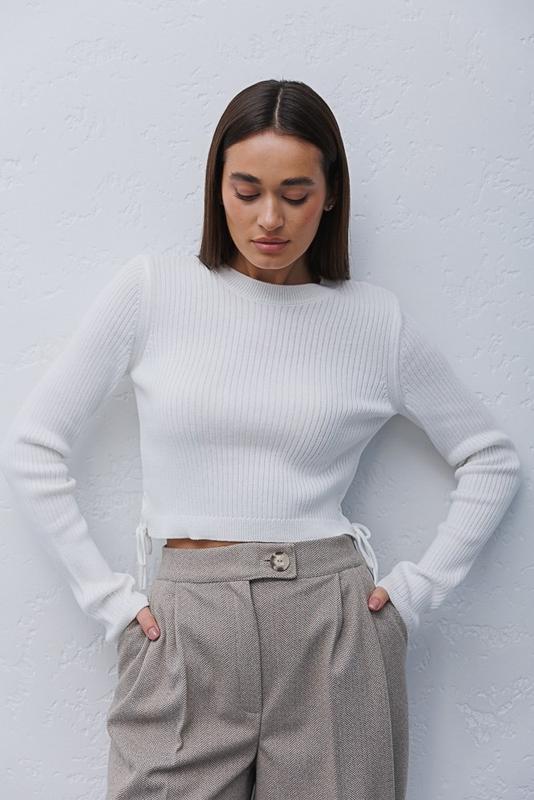 Вязаный кроп-топ светло-молочный с длинными рукавами и завязками по бокам