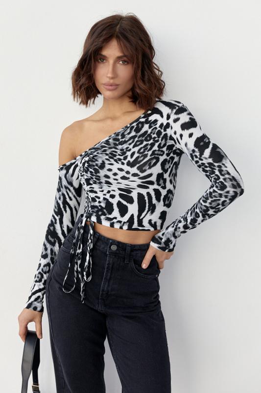 Модный кроп-топ, который покорит тебя не только трендовым дизайном, но и мягкой, приятной к телу тканью, уже ждет тебя! В данной модели с длинными рукавами края низа прямые. Верх - асимметричный, с открытым плечом. Справа, на полочке, топ украшен кулиской, которая внизу стягивается на завязки