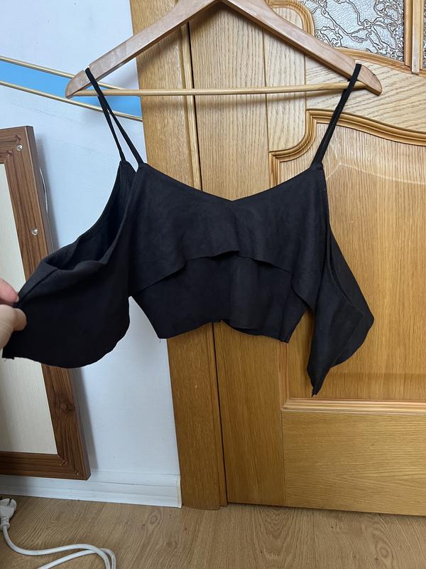 Черный топ с открытыми плечами Красивый топ от бренда Missguided. Модель на тонких бретелях. Застежка на замке сзади. Спереди двойной слой ткани. Укорочена модель.