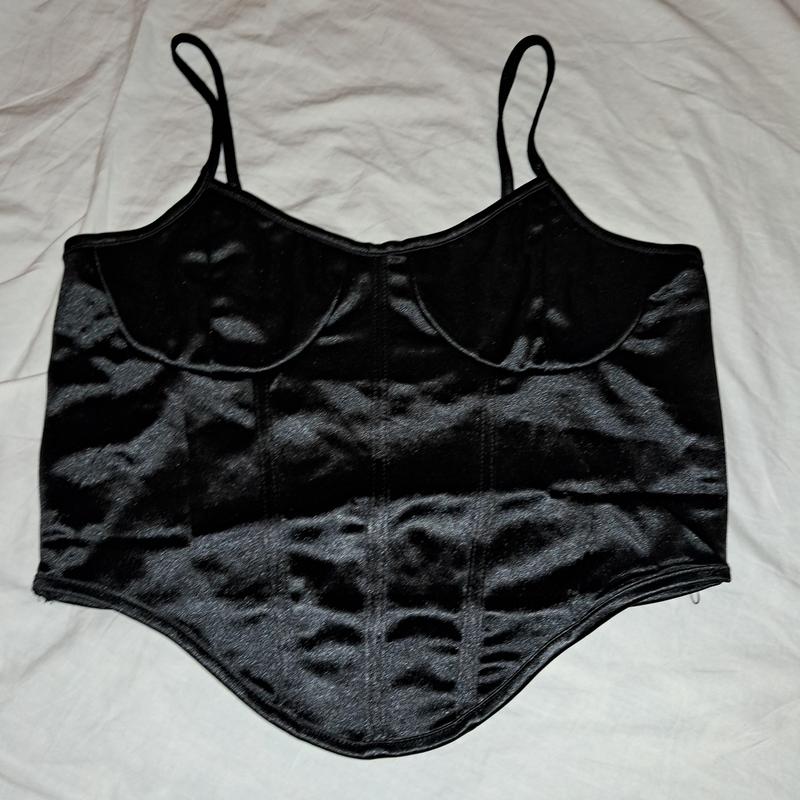 Женский топ корсет черного цвета размера L Материал: 65% полиэстер, 35% хлопок ткань переливается как на фото Нюанс: зацепки спереди слева, их видно на последнем фото (если надо еще сделать) Подойдет на чашечку В (паралоновых вставок нет, можно одевать на голое тело) По ширине он 37-38 см Все остальные настройки есть на фото