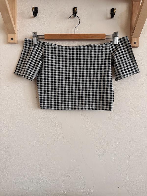 Трикотажный укороченный топ в клетку с открытыми плечами. Состояние идеальное. Приятный качественный материал.