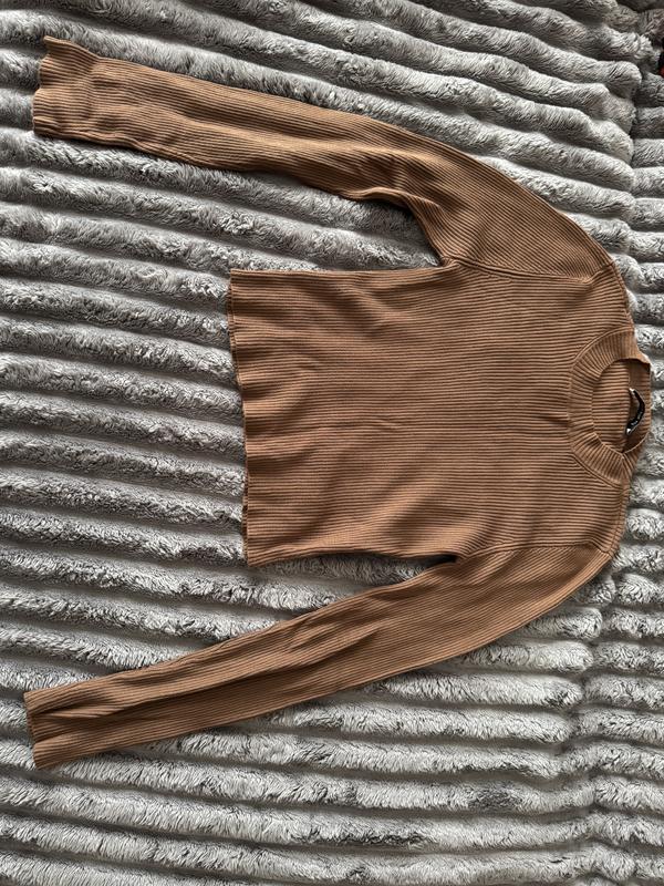 Приталенный топ, коричневого цвета, в очень хорошем состоянии. Длина топа 45см, длина рукава 64см.