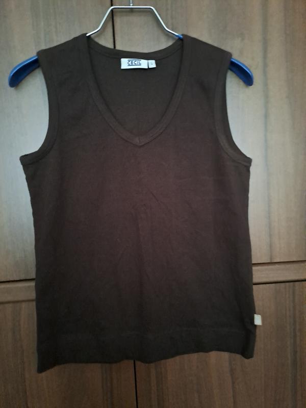 Женский топ, майечка без рукавов насыщенного шоколадного цвета. Обработка выреза декольте, пройм и все детали указывают на люксовое происхождение изделия. Трикотаж 100% коттон высшего сорта. Размер от производителя- S. Пог- 46, длина- 69 см. Сток. Состояние новой вещи.