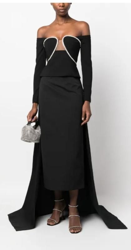 SELF-PORTRAIT Black Diamanté Off-Shoulder Corset Top Потрясающий, архитектурно выверенный топ Self-Portrait, который мгновенно завораживает взгляд. Модель с открытыми плечами и скульптурным корсетным лифом, декорированным сверкающими кристаллами по нестандартному асимметричному контуру. Роскошный визуальный эффект создаёт иллюзию огранки драгоценного камня, сияющего в лучах вечернего света. Полупрозрачная вставка между чашками придаёт образу пикантности, а плотный эластичный материал прекрасно держит форму и подчёркивает талию. Длинные рукава гармонично завершают силуэт, визуально вытягивая руки и добавляя элегантности. Потайная молния сзади обеспечивает удобство и идеальную посадку. Идеальный выбор для тех, кто хочет блистать на коктейльной вечеринке, светском ужине или фотосессии — это не просто одежда, это украшение гардероба и уверенности. Эта модель мгновенно распродаётся на всех площадках.