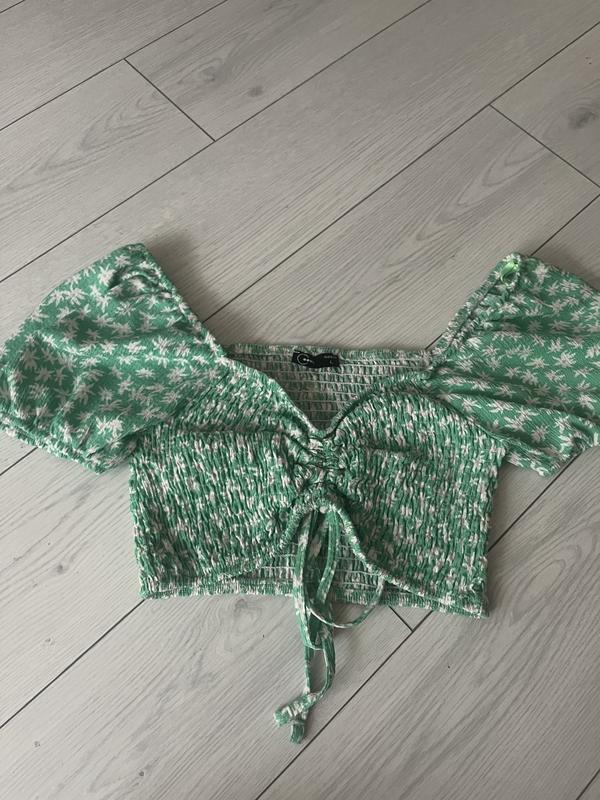 Літній укорочений топ зелений у квіточку — легкість і свіжість у кожному образі Цей топ — справжня знахідка для спекотних днів! Легка тканина дарує відчуття комфорту, а свіжий зелений колір із квітковим принтом створює ніжний, літній настрій. Укорочений фасон чудово поєднується з високою посадкою та підкреслює талію