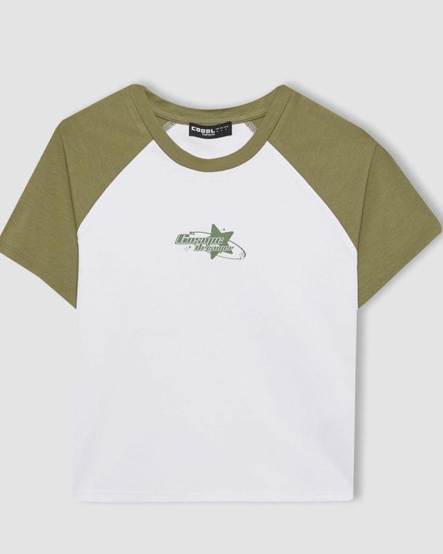 Облягаюча футолка — топ, зручна та приємна до тіла. Білий колір з оливковими рукавами та модний принт.