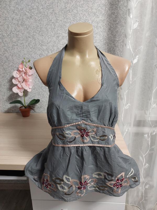 Женский серый топ с открытой спинкой бренда Rocha. John Rocha. из 68% коттона и 32% шелка, подкладка 100% ацетат, декор расшит 100% шелк, размером 18,48-50. В идеальном состоянии, не тянется, не просвечивается, с застежкой молнией со стороны. Завязывается с уда на шее на бантик.Все замеры на фото, качество отлично.