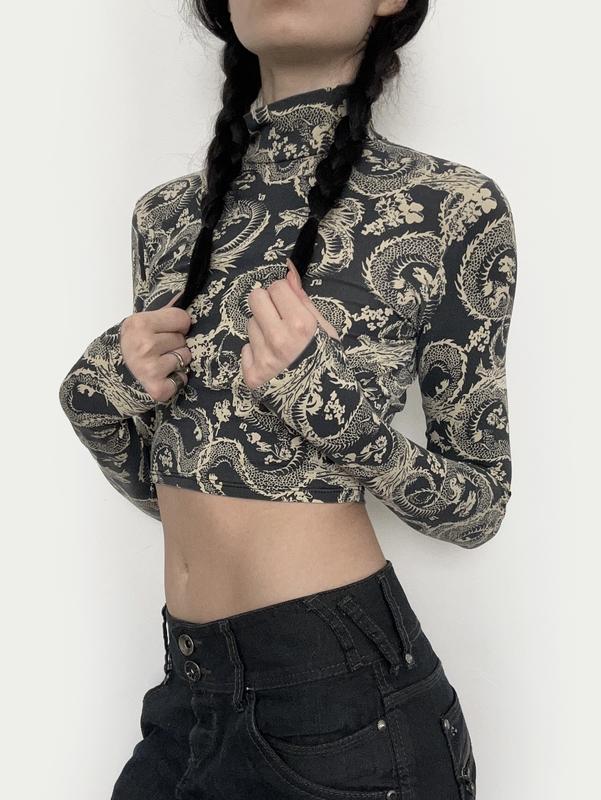 Топ з азійським принтом y2k з горлом та довгим рукавом