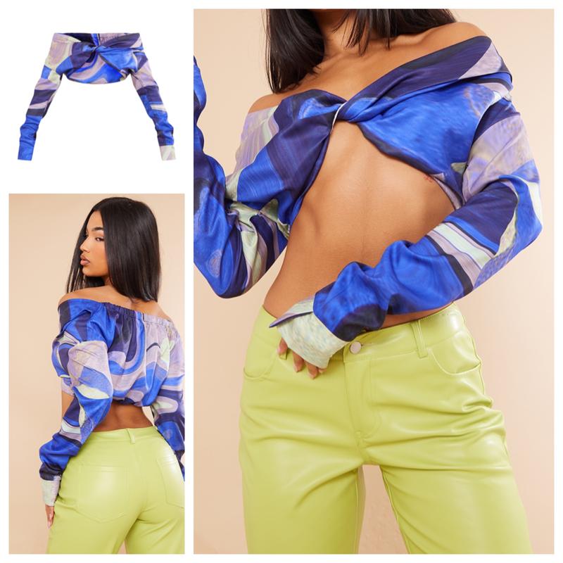 Кроп топ з довгими рукавами і відкритими плечима з абстрактним принтом