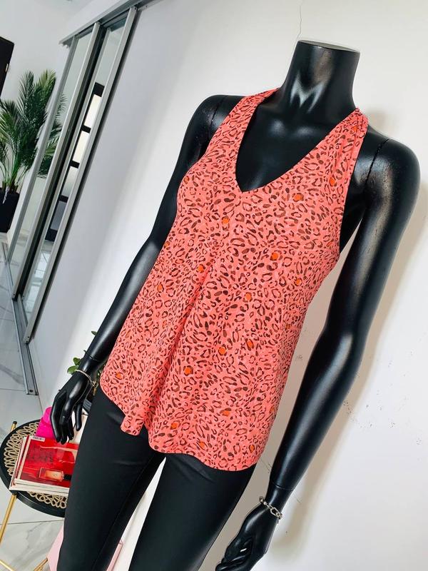 Яркий женский топ Next кораллового (лососевого) цвета с мелким анималистичным/леопардовым принтом. Модель-халтер (завязки или широкая лямка вокруг шеи) с красивым вырезом на спине. Состав: 96% полиэстер, 4% эластан. Идеально для летнего образа. Размер UK 8 / EU 36.