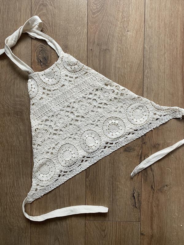 Це мереживний трикутний топ-бандана кольору айворі. Має зав’язку на шию й дві зав’язки знизу для фіксації на спині. Мереживо щільне, з круглими та геометричними візерунками.