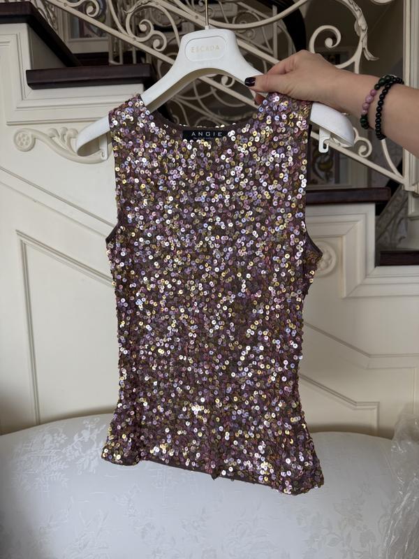 Розмір М Сяючий топ, щедро розшитий паєтками у золотисто-рожевих відтінках, ловить світло з кожного руху. Легкий, ефектний та неймовірно святковий — ідеальний для заходів, де хочеться засяяти без пафосу, але з класом.