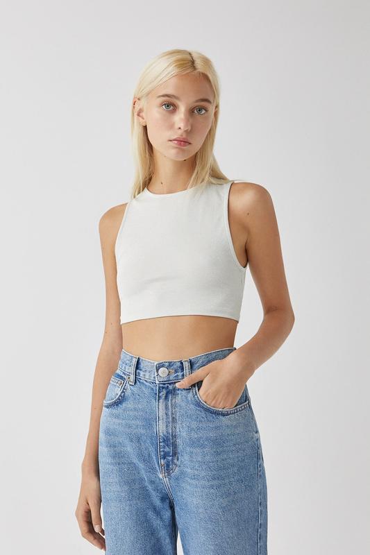 Топ без рукавов с круглым воротником и вырезом на спине. Блестящая ткань с легким эластичным эффектом.