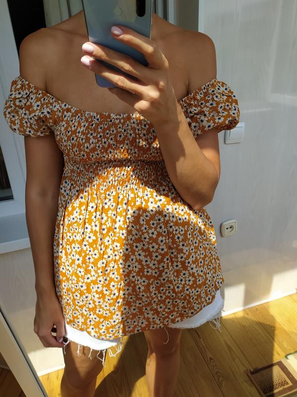 летний топ в цветочек с открытыми плечами ,одет на 86-69-95