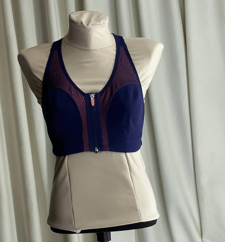 Топ спортивный темно-синего цвета с вставками сеточки и молнии ТМ M&S🛍❤️🔥😍😍😍 Размер - UK 36C/ EUR 80C / S-M/ 44-46 ( русский ). Состав: 65% полиамид , 19% еластан, 16% полиэстр . Производство Китай . Топ спортивный с разьемной молнией переда . Вставки сеточки на розовом фоне. Размер чашки C (3). Средней ширины резинка низа . Чашка мягкая с подкладкой . Дополнительные замеры : полная длина 27 см, полуобхват груди 40 см ( полный обхват 80 см) и потянется до 110 см, полуобхват резинки низа 33 см ( полный обхват 66 см ) и потянется до 80 см. Высота молнии 15 см.