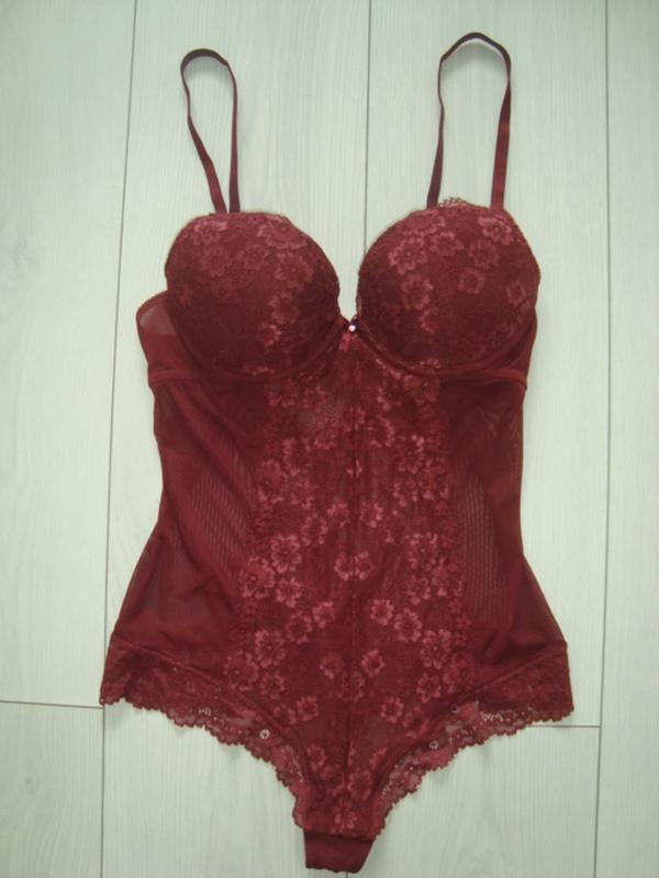 У продажу дуже красиве боді-стрінг від H&M, розмір по бирці вказаний 38. Колір-вино. Щільна чашка з пуш ап. Боді виконано з мережива і тюлю. Довжина боді (без урахування верхніх ременів)-54см, напівобхоплення під грудьми-30см, ПОТ-30см, ПОБ-37см, висота чашки по центру з внутрішньої сторони-12см, ширина чашки з поглибленням-16,5см, дуга кісточки-19,5см, ширина двох чашок-29см. Стан боді ідеальний
