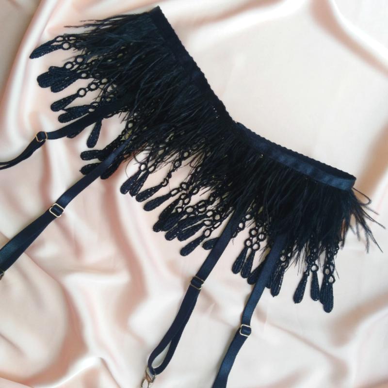Пояс для чулок из натуральных страусиных перышек и кружева кисточкой ручной работы. Пояс - это идеальное дополнение к любому комплекту нижнего белья. Если хотите разнообразить Ваши будни, то купив у нас пояс для чулок, у Вас будет шикарный романтический вечер🍾🥂 Пояс с регулировкой сзади👌 В наличии размер S/М. Под заказ, сошьем любой размер по Вашим меркам. Также можно заказать красного, розового цвета или айвори (фото кружева этих цветов вышлем по запросу, т.к. они разные). Доступные цвета - черный, красный, розовый и айвори (2 вида).