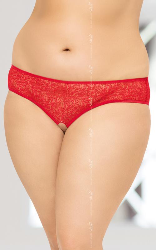 Трусики-стрінги виконані в червоному кольорі з сітчастого матеріалу з мереживним візерунком. Модель з пікантним вирізом, обробленим блискучими стразами і відкритими сідницями. Чудово підійдуть для дам з пишними формами.