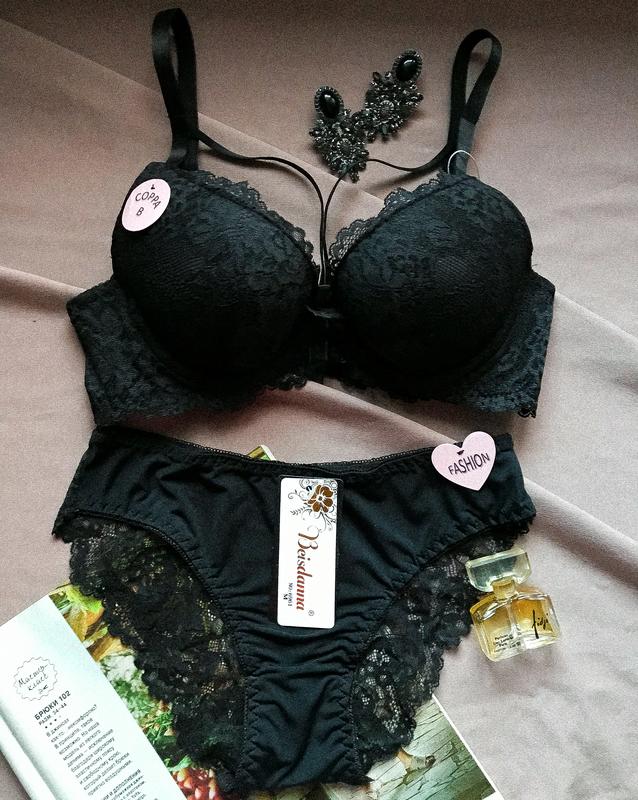 Ажурный комплект, бюстгальтер на тонком поролоне с небольшим корректором, спереди портупея, съемные бретели. Чашка: В Размеры: 42 (объем под грудью 75), 44 (объем под грудью 80), 46 (объем под грудью 85). Цвета: Черный. В наличии: Черный М (75В)