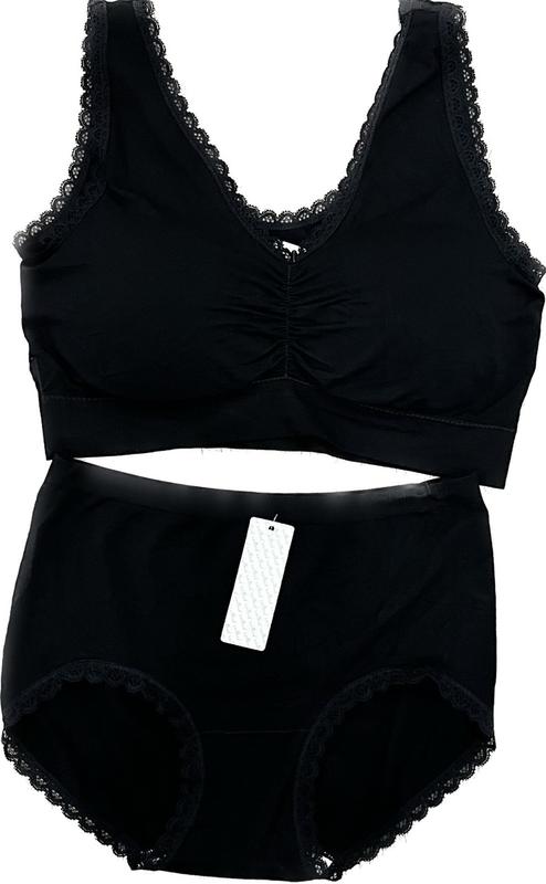 Однотонный гладкий комплект с элементами гипюра, топ со съемным сплошным поролоном-корректором. Материал - район + хлопок. Объем: 90/95 Чашка: D Трусы: 48/50