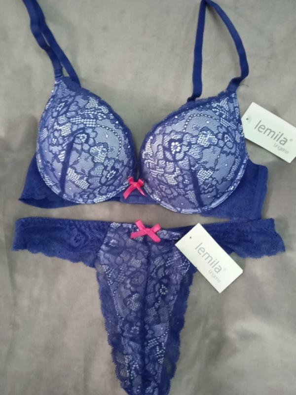 Комплект - бюстгальтер пуш-ап (+2) і стрінги, 80A/L. Бретелі відщіпаються, є бокова кісточка. Ширина під грудьми 32-39см. Ширина трусиків 33,5-41см, висота посадки спереду 18см, ззаду 19см.