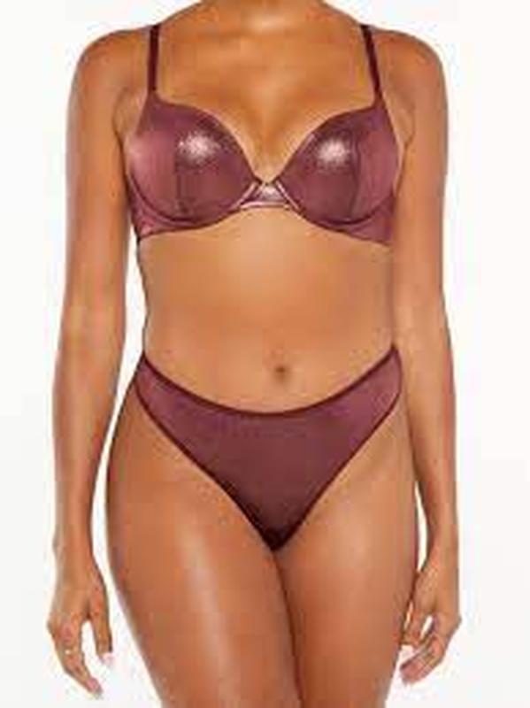 Комплект верх і низ можна підібрати по розміру або придбати окремо Після або перед оформленням замовлення уточнюйте розміри Розмір ліфів: 70C, 75D, 80E Трусики: XS, S, M Мікрофібра металева фольга Гладке, гладке відчуття, яке обіймає ваші вигини Легка підкладка Спинка в клітці Фурнітура рожевого золота, включаючи брелок «X» у центрі спереду Регульовані лямки з логотипом Застібка на гачок і вушко ззаду 75% нейлон, 25% еластан Прати вручну холодною водою та сушити на білизні Не віджимайте та не сушіть у пральній машині