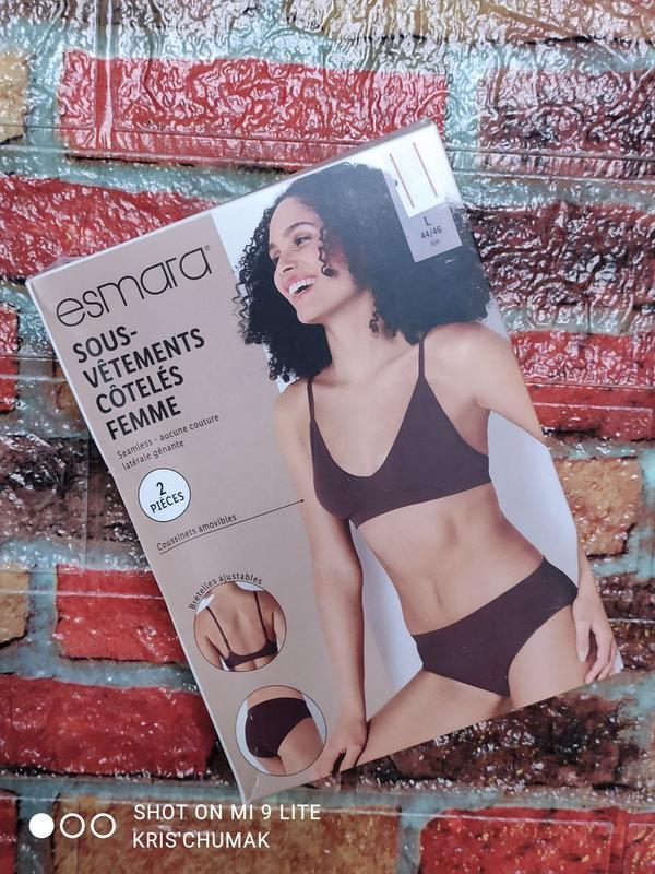 Набор,комплект бесшовный Топ-лиф + трусики в рубчик без косточек Съемные поролоновые подушечки Брители регулируются не сьемные Без застежки Трусики слип высокая посадка Состав 82% полиамид, 8% эластан, Размер евро L 44/46 Замеры Бюст Полуобхват под груди-33(тянется до 52) Высота чашки -19 Ширина чашки-17 Трусики Глубина-26 Талия-32(тянется до51) в упаковке производителя и всеми вшитыми ярлыками свернут