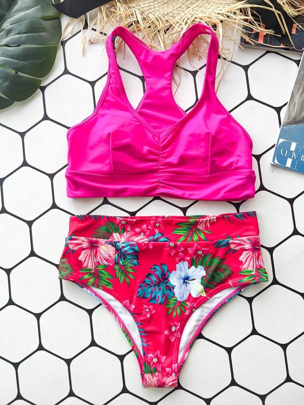 Спортивный купальник топ-боксерка и высокие закрытые бикини цветы
