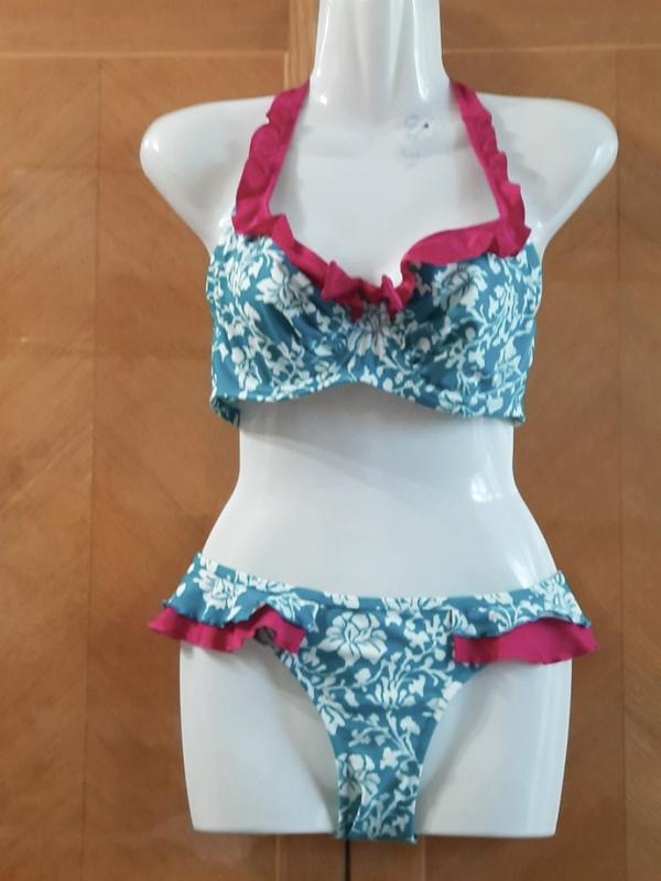 Красивый раздельный купальник от известного бренда Pour Moi. Замеры делали с середины. Верх : На бирочке размер 32 DD. Чашечки на косточках по 22 см, мягкий, БЕЗ поролона, ширина 22 см, высота повесеня от плеча (от бретели ) 26 см. Ширина между чашками снизу 6 см. Высота между чашками 8 см. Бретели завязываются на шее. Длина по низу 62 см, тянется до 80 см, плюс застежка 1,5 см. Низ : На бирочке размер 8. Спереди частично на подкладке. Полуобхват по резинке сверху 32 см ( тянется до 42 см). Высота по середине 21 см, по боку 4,5 см. Склад на фото. Камера не совсем верна передает цвета, ближе всего 3 фото. ❗️Отправляем после полной платы на карточку Приватбанка. ❗️Доставка Новой или Укр по почте за средства покупателя. ❗️Возвращение и обмен НЕТ ❗️ *5149*