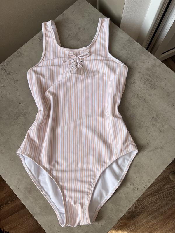 Бежевый купальник на рост 158-164 см в белую полоску со шнуровкой слитный 🥰 xs-s george