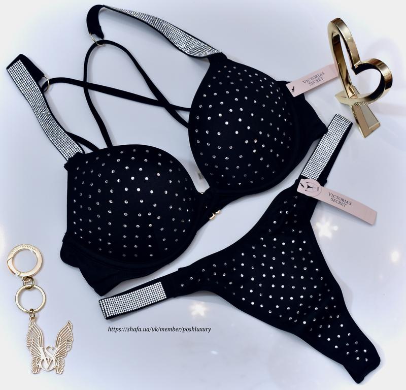 Shine Strap Bombshell Push-Up Bikini Top & Shine Strap Thong Bikini Bottom Размер 32С(70C) и S (ОБ от 92 до 98 см) Также подойдет на размер 34В(75В) Этот неповторимый стиль сочетает в себе максимальный Пуш-Ап и гламур: от блестящих ремешков со стразами до сверкающих бриллиантов на чашках. Шлейки на спине завершают этот великолепный образ. - форма чашки "пуш-ап" увеличивает грудь на 2 размера. - максимальный Push-Up. - на косточках - регулируемые бретели со стразами. - застежка на крючок сзади, имеет 3 петли для регулирования объёма. Плавки в форме "тонг" (стринг). - сзади открыты, красиво подчеркивают форму ягодиц. - низкая посадка - высокая линия бедра - стразы на боковинках и выложенная передняя часть плавок камешками Предусмотрена ручная стирка Состав Основная часть: 80% полиамид, 20% эластан. Подкладка: 92% полиэстер, 8% эластан. Подкладка чашки: 100% полиэстер. 100% и безусловный ОРИГИНАЛ. С бирками, пломбами, в упаковке. ТОРГ, обмен, возврат НЕ ПРЕДУСМОТРЕНЫ! 💫 Работаю с безопасной оплатой от сайта. 💫 Есть наложенный платеж с условием аванса за доставку. 💫 Отправка посылок ежедневно в течение часа после оплаты. 💫 Есть подарочные бумажные пакеты и ОРИГИНАЛЬНЫЕ(!) коробки, которые можно прибрести за отдельную плату. 🛍🎁