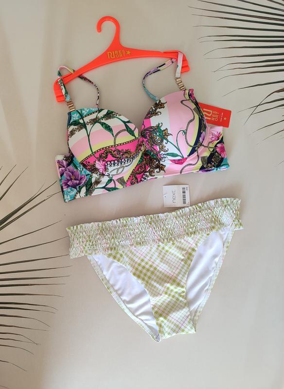 стильный купальник ☀️ верх бренд River Island 🌸 модель балконет/ бюстье чашки из ПУШ АП, на косточках с металлическим декором на бретельках бретельки регулируются по длине и их можно перестигнуть крест на крест сзади на застежке молнии 😉 размер 38 на М (Pо сядет на 75В возможно 75С) Замеры: Полная длина от края до края в спокойном состоянии 69 см тянется до 83 см замеры чашки с внутренней стороны высота по центру углубляясь 14,5 см ширина глубина 17,5 см НОВИЙ 💛 с бумажными бирками и в упаковке) плавочки низ купальника 💚 средняя посадка, по верху пояс "жатка" бренд Next размер 10/38/М НОВЫЕ) с бумажными бирками 🌿 До этого размера верха есть еще много разных плавок, смотрите Мои объявления )