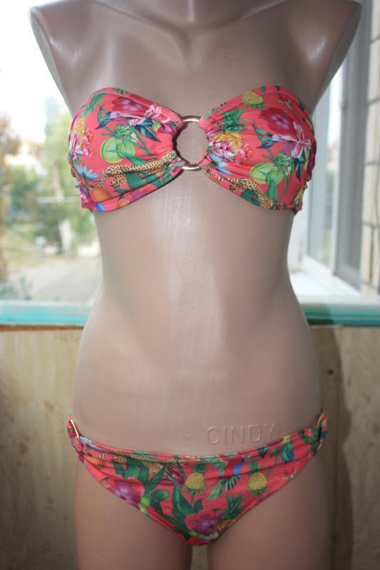 Красивый яркий купальник в актуальный тропический принт Размер 8 Состояние очень хорошее Замеры: объём верха 70 (тянется), высота чашки 14. Сверху есть силиконовая полосочка, чтоб лиф хорошо держался. Талия на плавках 40, высота 22. ! В наличии большой выбор серёжек-кисточек, стильной бижутерии, недорогой интересной одежды и очков! Заходите в гости)
