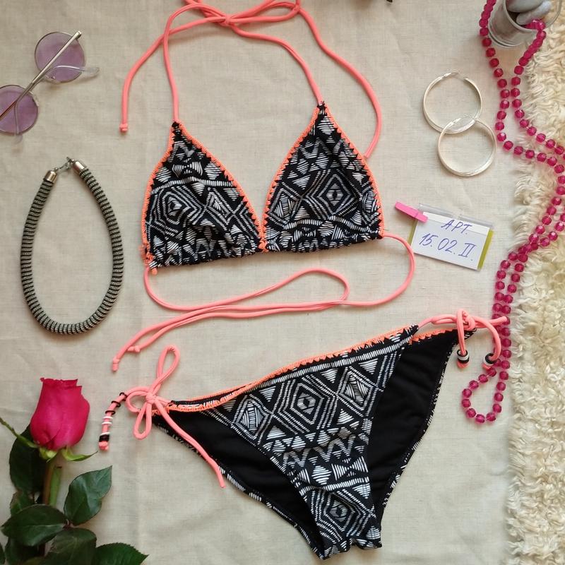 раздельный купальник чёрно-белый+ коралловый оторочка 36-38 лиф ширина по низу 16 по верху 17 есть карманы для чашек есть один незначительный нюанс абсолютно незаметно плавки в отличном состоянии также на завязках поясе 39 51 положение как на фото максимальная высота по крайним точкам 22 .5 см. полностью двойные
