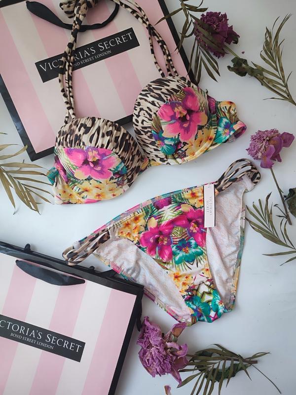32a (70A) + S есть разные размеры и варианты 🌸 Шикарный цветочный купальник Victorias Secret из неповторимой коллекции Bombshell из итальянской ткани, лиф с двойным пуш-ап эффектом для максимального подъема, украшенный тройными сексуальными бретелями Верх Strappy Add-2-Cups Push-Up Halter Top Сногсшибательный бюстгалтер с пуш-ап чашечкам, добавляющими 2 размера, на косточках. На спине регулируемая застежка золотого цвета. Тройные бретели, переходящие в одинарную мягкую бретель, завязываются на шее. Низ Strappy String Bottom Трусики-бикини с посадкой на бедрах, закрытые сзади, привлекательно декорированы по бокам тройными бретелями. Полностью на подкладке. Шикарная итальянская ткань с шелковистым блеском . .. #0449с