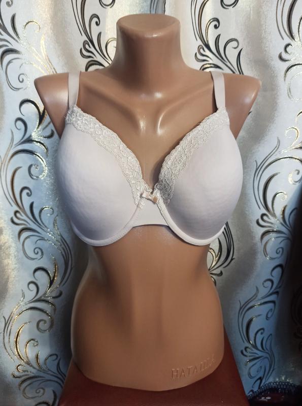 Базовий бюстгальтер з мереживом Marks&Spencer. Чашка на поролоні. Бретелі не знімаються. Розмір - 34f 75f. Заміри: висота чашки по центру 19,5 см, ширина чашки 24 см, довжина кісточки 27,5 см, довжина пояса у спокійному стані 71 см, тягнеться до 85 см. Застібка - гачки та люверси у два ряди. Всі ярлички зрізані. Склад: 54% поліамід, 30% поліестер, 16% еластан. В дуже хорошому стані