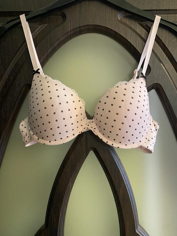 Шикарний, базовий, бюстгальтер, котоновий, ніжно розового кольору, в чорний горошок, з низу є пуш ап в 2 см. Дуже красиво, і сексуально, виглядає на грудях. Зручний на кожен день. Брендовоі фірми: H&M. Виробник Бангладеш. Виміри чашки бюстгальтера: ширина 15 см. довжина 13 см. Розмір вказано: 34В/75В. Склад: 77% котон, 19% полістер, 4% еластину. В обхваті, в спокійному, стані, 70 см. тянеться до 90 см.