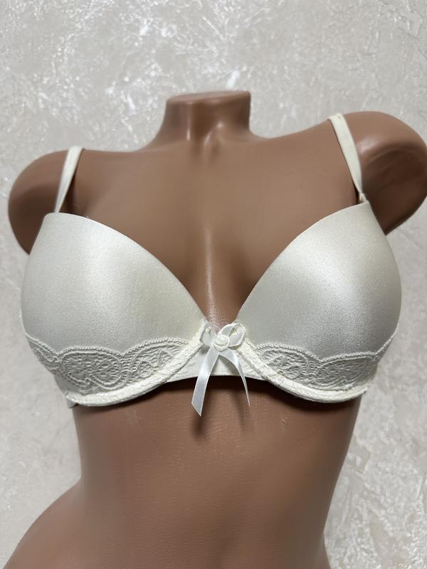 Бюстгальтер "пуш ап" из гладкого эластичного трикотажного полотна с шелковым блеском, на каркасах, с кружевной отделкой, декорирован бантом , изнутри трикотажное хлопковое полотно, встроен поролоновый пуш ап. Регулируемые бретели. Застежка на 3 крючка.