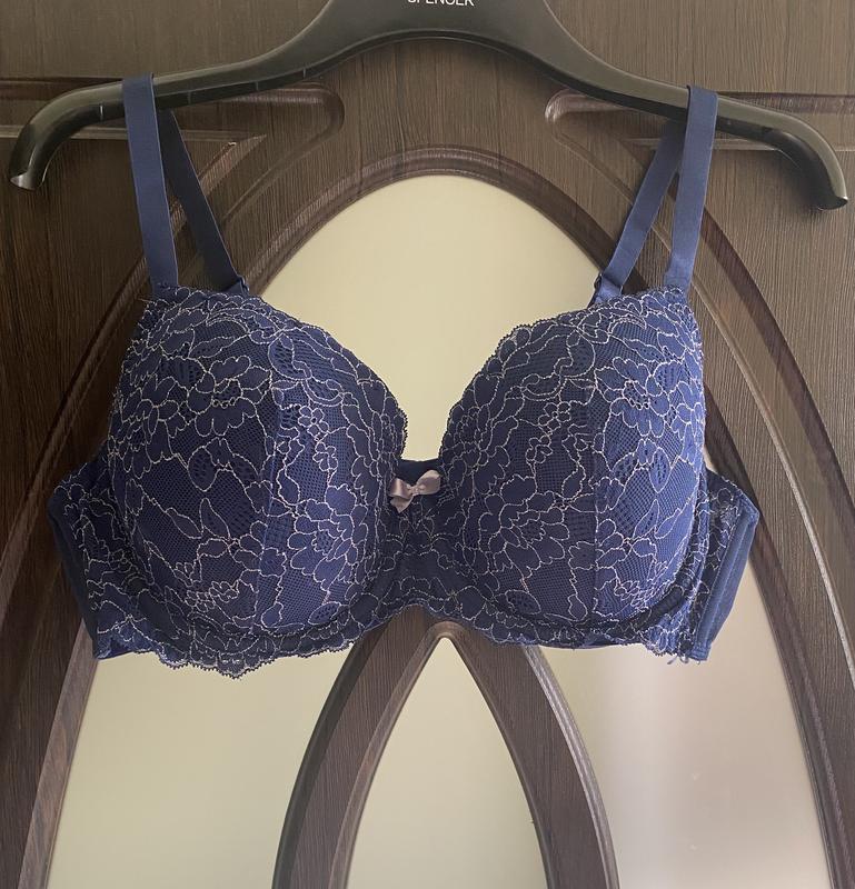 Шикарний, базовий, ажурний, бюстгальтер, темно синього, кольору, з сірим оздобленням 👌. Нереально, гарний. Дуже красиво, і сексуально, виглядає, на грудях. Зручний, на кожен день. Брендовоі фірми: George. Заміри чашки бюстгальтера: ширина 24 см. довжина 18 см. Розмір вказаний: 40D/90D. Склад: 60% полімід, 29%полістер, 11% еластину. В обхваті, в спокійному, стані, 86 см. тянеться до 108 см.