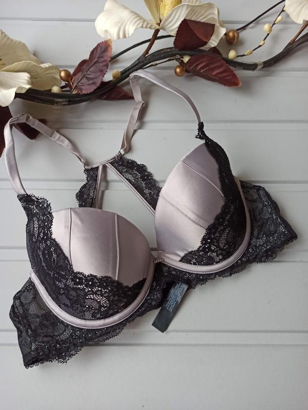 Красивый бюстгальтер из серебристо серого сатина и черного кружева. С мягким пуш-ап около 0.5 см, без боковых косточек. Красивая кружевная Х спинка. Размер 75В, замеры на последней фотографии, тянется до 44 см в полуобъеме, застегнутый на крайние крючки. Состав 92% полиэстер 8% эластан