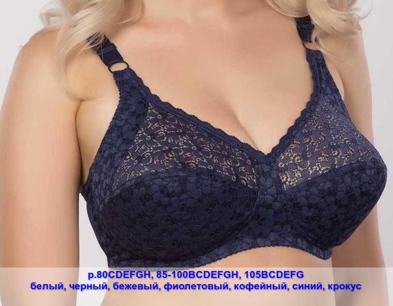 Бюстгальтер без каркасов с мягкими чашками из эластичного, трикотажного и кружевного полотна. Боковая корректирующая деталь с тонким поролоном и нижние детали чашек дублированы хлопковым полотном. Размерный ряд: • 80C 80D 80E 80F 80G 80H • 85B 85C 85D 85E 85F 85G 85H • 90B 90C 90D 90E 90F 90G 90H • 95B 95C 95D 95E 95F 95G 95H • 100B 100C 100D 100E 100F 100G 100H 105B 105C 105D 105E 105F 105G Цветовые решения: белый, бежевый, черный, фиолетовый, какао, синий, крокус. Состав: хлопок 35%, полиамид 51%, эластан 9%, полиэстер 5% В зависимости от размера бюстгальтера количество крючков на застежке и ширина бретельной ленты могут быть разными. Количество крючков: • 80CDEF 85BCDEF 90BCDEF 95BCDEF 100CDE - 2 ряда крючков • 85GH 90GH 95GH 100F - 3 ряда крючков Ширина бретельной ленты: • 80CDEF 85BCDEFGH 90BCDEFG 95BCDEF 100CDE - 2 см • 90H 95GH 100F - 2,5 см