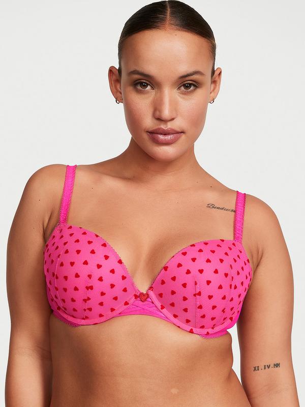 Бюстгальтер розовый в сердечки фирмы Victoria's Secret Фасон push-up Размер указанный 32В (наш 70В) Длина шлеек регулируется, спереди они пришиты, сзади - отстегиваются Состояние новое, с этикеткой