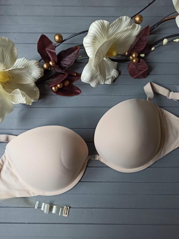 Шикарный гладкий бюстгальтер с мягким пуш-ап около 1 см. Мостик и съемная спинка силиконовые. Бретели съемные, в комплекте запасные. Внутри чашек комфортная микрофибра. Размер 80Е, замеры на последней фотографии, тянется до 88 см, спинка регулируется. Состав 56% полиамид 28% полиэстер 16% эластан