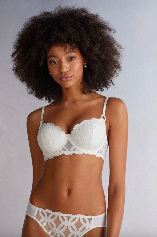 Бюстгальтер балконет Sofia с вышивкой элегантного геометрического узора в сочетании с фатином и микрофиброй. Ремешки украшены оригинальной фурнитурой, например, обтянутыми тканью кольцами. • Слегка подбитые чашки • На косточках • Подкладка из микрофибры и регулируемые бретельки на спине • Отличная поддержка • Подчеркивает декольте, округляя форму Композиция Полиэстер: 79%, полиамид: 17%, эластан: 4%,