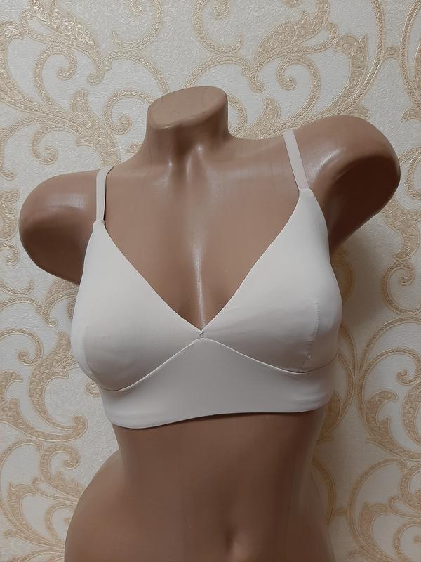 Гладкий бюстгальтер бралетт с мягкой чашкой без косточек M&S Небольшой нюанс показала на последнем фото (затяжечки от бирки только на внутренней подкладке), в остальном всё отлично Объём в спокойном состоянии 62 см, тянется до 83 см Чашка без поролона и без косточек Высота чашки 15 см, ширина 18 см