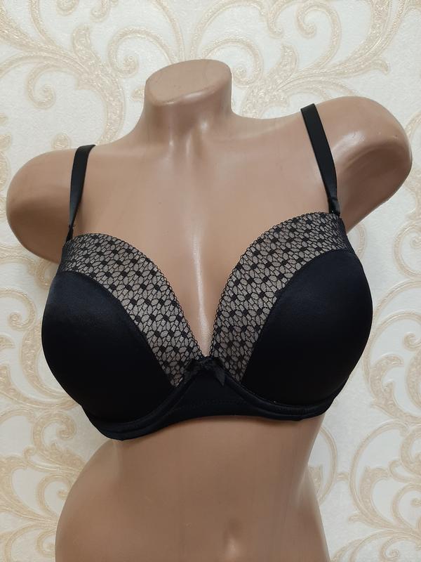 Красивый бюстгальтер с небольшим пуш ап и съёмными бретелями M&S Состояние отличное, только поролон на одной чашке немножко примят Объём в спокойном состоянии 68 см, тянется до 90 см Чашка с пуш ап Высота чашки 17 см, ширина 21 см