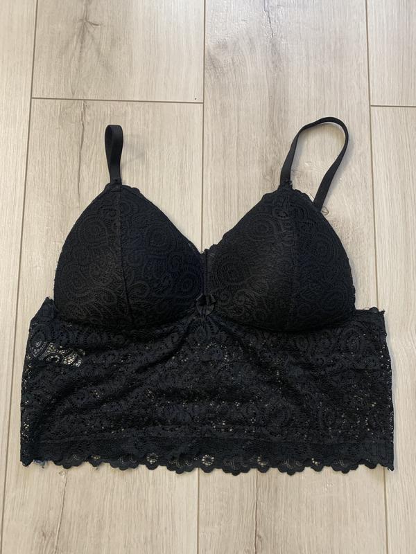 Черный кружевной топ с мягкими чашками. Элегантный дизайн с ажурным кружевом и изящной вставкой под грудью. Тонкие бретели регулируются для удобной посадки. Идеальный выбор для комфортной ежедневной носки или особых случаев. Состояние: очень хороший. Размер: 38 Материал: кружево, мягкая подкладка.